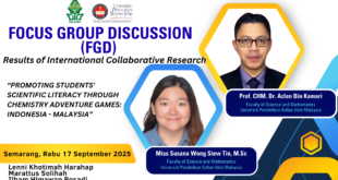 Semarang, 18 November 2022 – Program Studi Pendidikan Kimia UIN Walisongo Semarang kembali menggelar kegiatan kuliah tamu yang sangat inspiratif pada tanggal 15 November 2022. Acara ini diselenggarakan melalui platform Zoom Meeting dan juga dapat diakses melalui kanal Youtube Prodi Pendidikan Kimia UIN Walisongo Semarang di tautan berikut https://www.youtube.com/watch?v=o2qJCE7d1VU. Kali ini, narasumber yang diundang adalah Dr. Sabar Nurrohman, M.Pd, seorang …